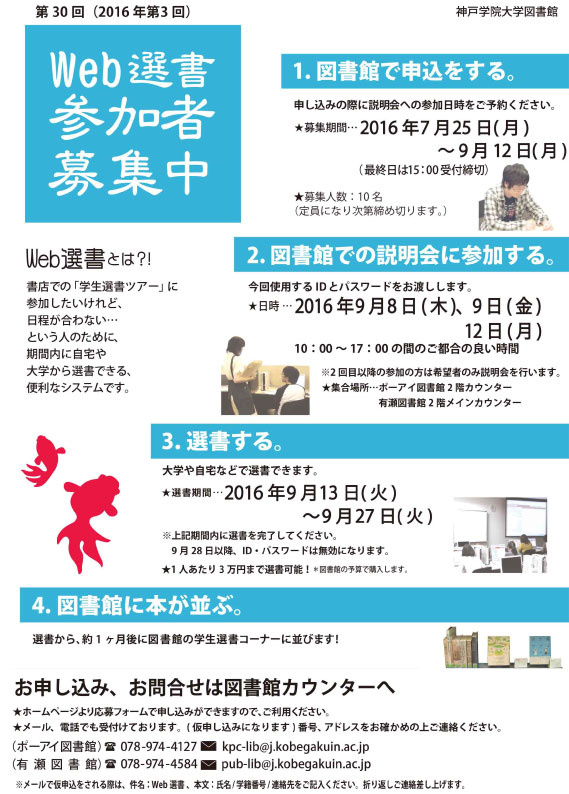 一覧へ 【全館】〈終了〉第30回ウェブ選書参加者を募集しています 投稿日時: 2016/07/29 図書館管理者 第30回(2016年第3回)ウェブ選書参加者を募集しています。お申し込みフォームは>>コチラ