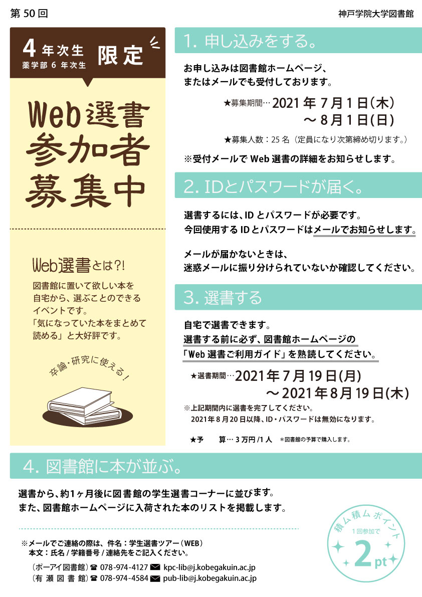 一覧へ 【全館】〈終了〉第50回ウェブ選書ログインについて 投稿日時: 2021/07/16 図書館管理者 第50回ウェブ選書ログインについて選書に参加される方は、ご利用ガイドに従い、ウェブ選書の実施をお願いいたします。【ウェブ選書ご利用ガイド】.pdf ウェブ選書ログインはこちら