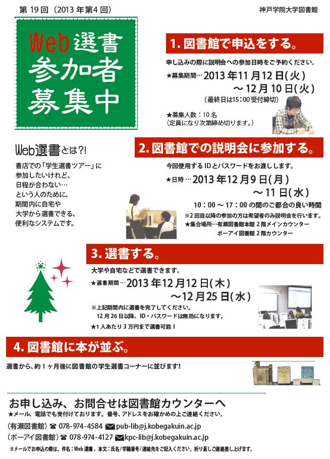 一覧へ 【全館】〈終了〉第19回ウェブ選書参加者を募集しています 投稿日時: 2013/12/11 図書館管理者 ▼第19回ウェブ選書募集期間:2013年11月12日(火)~12月10日(火)選書期間:2013年12月12日(木)~12月25日(水)詳細はこちら↓
