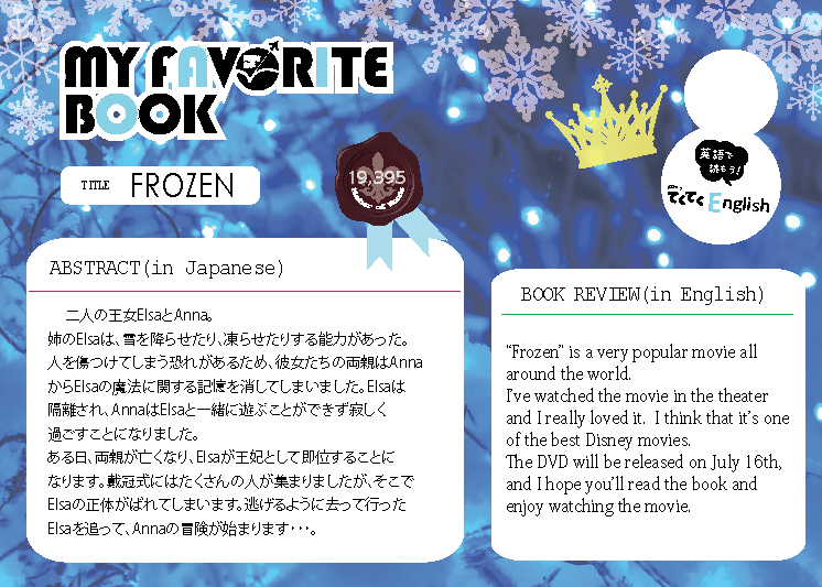 一覧へ 【有瀬館】〈終了〉My Favorite Book 「FROZEN」を開催しています 投稿日時: 2014/07/14 図書館管理者 My Favorite Book(安田有紀子先生)FROZEN ※有瀬図書館新館1階Aにて展示しています。