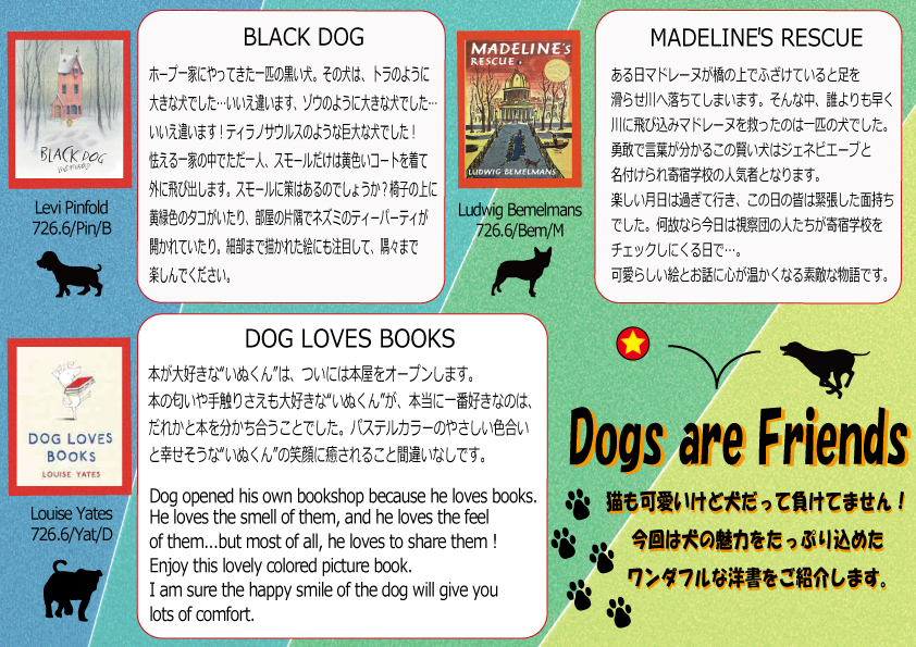 一覧へ 【ポーアイ館】〈終了〉てくてくSelection「Dogs are Friends」を開催しています 投稿日時: 2019/04/02 図書館管理者 てくてくSelectionDogs are Friends 展示リストはこちら.pdf※ポーアイ図書館2階図書館留学コーナーにて展示しています。