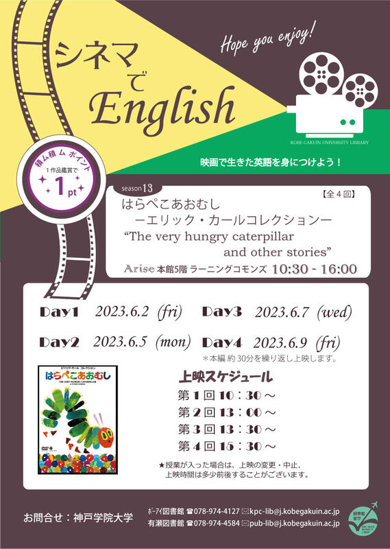 一覧へ 【有瀬館】〈終了〉シネマでEnglish「はらぺこあおむし-エリック・カールコレクション-」を開催します 投稿日時: 2023/04/24 図書館管理者 【有瀬図書館】シネマでEnglish「はらぺこあおむし-エリック・カールコレクション-」を開催します。