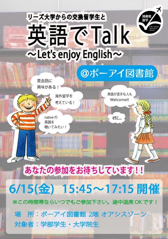 一覧へ 【ポーアイ館】〈終了〉「英語でTalk~Let's enjoy English~」を開催します 投稿日時: 2018/05/28 図書館管理者 【ポーアイ図書館】「英語でTalk~Let's enjoy English~」を開催します