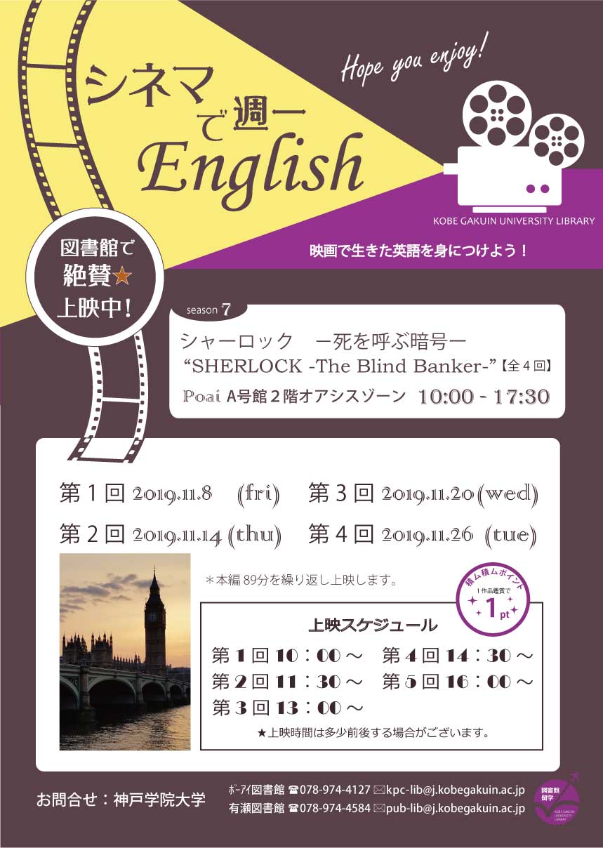 一覧へ 【ポーアイ館】〈終了〉シネマで週一English「SHERLOCK」を開催します 投稿日時: 2019/11/05 図書館管理者 【ポーアイ図書館】シネマで週一English「SHERLOCK」を開催します。