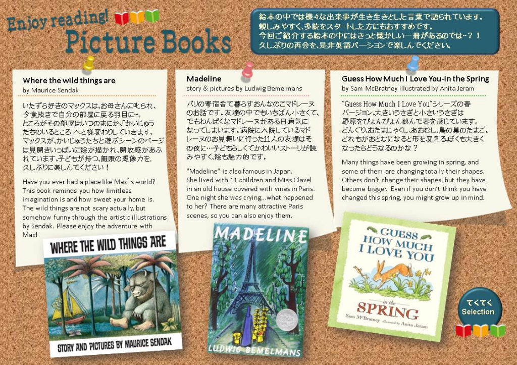 一覧へ 【有瀬館】てくてくSelecton「Enjoy reading Picture books!」を開催しています 投稿日時: 2015/06/09 図書館管理者 てくてくSelectionEnjoy reading picture books!書籍リストはこちら.pdf ※有瀬図書館新館1階Aにて展示しています。