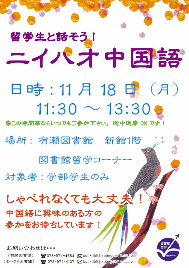 留学生の皆さんは日本語も堪能ですので、しゃべれなくても大丈夫!生の中国語に触れる刺激を味わいたい方、ぜひ参加をお待ちしています。詳しくは図書館カウンターまでお問い合わせください。