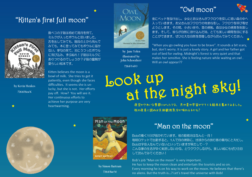一覧へ 【有瀬館】〈終了〉てくてくSelection「Look up at the night sky!」を開催しています 投稿日時: 2017/09/25 図書館管理者 てくてくSelectionLook up at the night sky! 展示リストはこちら.pdf※有瀬図書館新館1階Aにて展示しています。