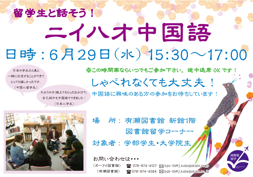 留学生の皆さんは日本語も堪能ですので、しゃべれなくても大丈夫!生の中国語に触れる刺激を味わいたい方、ぜひ参加をお待ちしています。詳しくは図書館カウンターまでお問い合わせください。