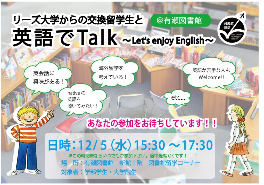 一覧へ 【有瀬館】〈終了〉図書館留学「英語でTalk~Let's enjoy English~」を開催します 投稿日時: 2018/11/05 図書館管理者 【有瀬図書館】「英語でTalk~Let's enjoy English~」を開催します