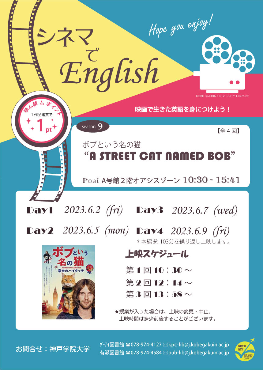 一覧へ 【ポーアイ図書館】〈終了〉シネマでEnglish「ボブという名の猫」を開催します 投稿日時: 2023/05/11 図書館管理者 【ポーアイ図書館】シネマでEnglish「ボブという名の猫」を開催します。