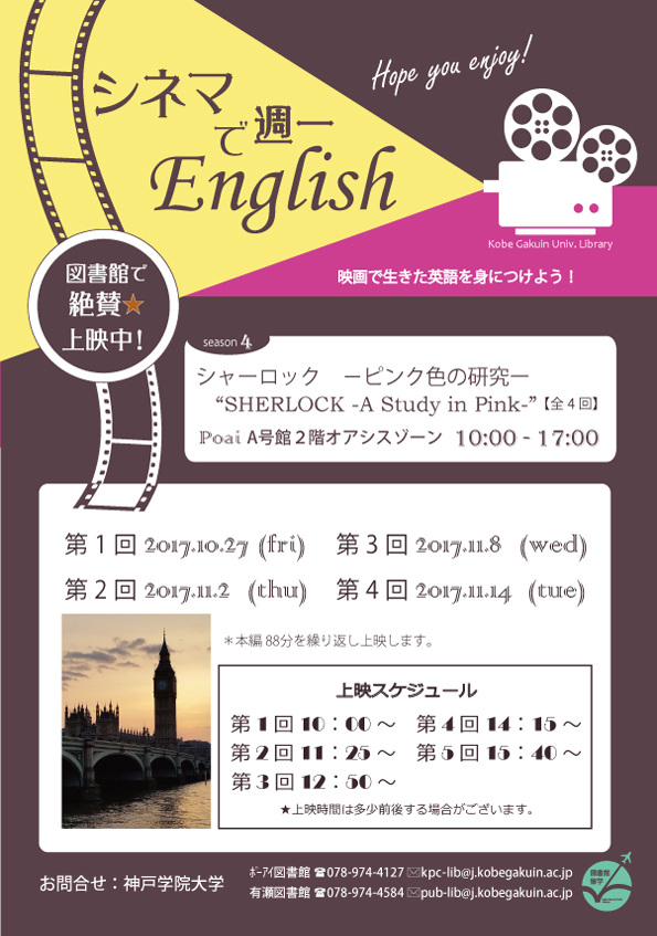 一覧へ 【ポーアイ館】〈終了〉シネマで週一English「SHERLOCK -A STUDY IN PINK-」を開催します 投稿日時: 2017/10/19 図書館管理者 【ポーアイ図書館】シネマで週一English「SHERLOCK -A STUDY IN PINK-」を開催します。