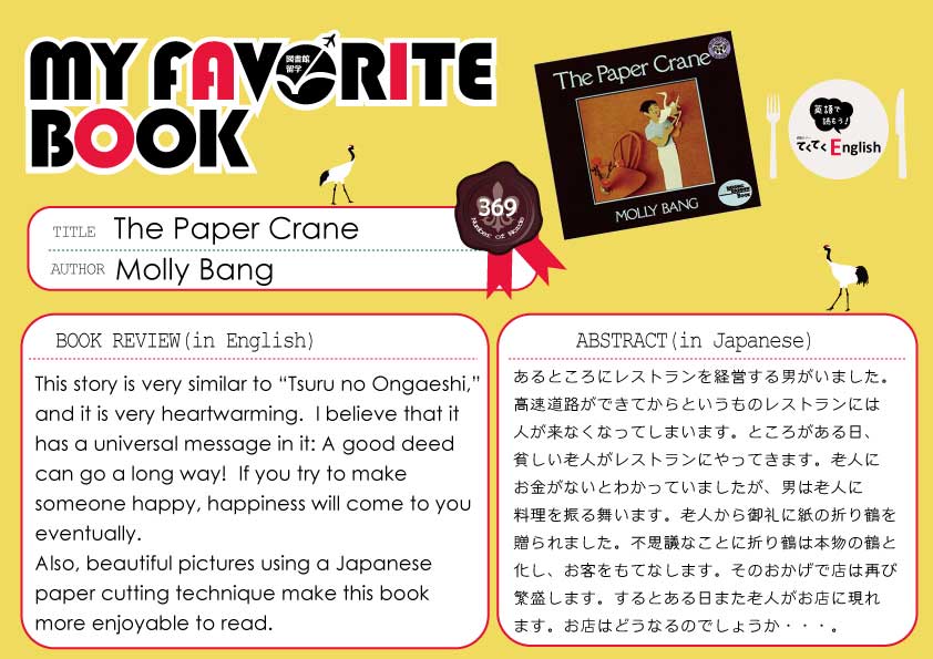 一覧へ 【全館】〈終了〉My Favorite Book「The paper crane」を開催しています 投稿日時: 2019/01/07 図書館管理者 My Favorite Book(安田有紀子先生)The paper crane※ポーアイ図書館2階図書館留学コーナーにて展示しています。※有瀬図書館新館1階A図書館留学コーナーに展示しています。