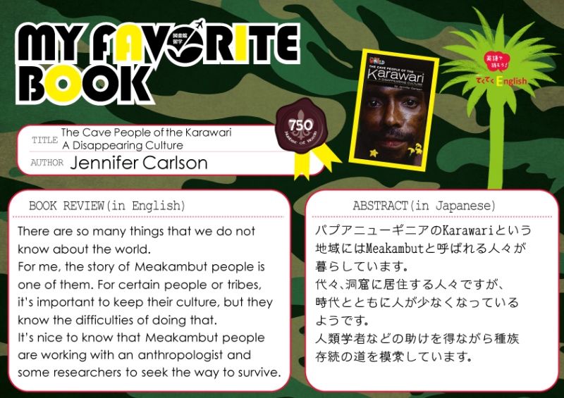 My Favorite Book(安田有紀子先生)The Cave People of the Karawari A Disappearing Culture※ポーアイ図書館2階図書館留学コーナーにて展示しています。※有瀬図書館新館1階A図書館留学コーナーに展示しています。