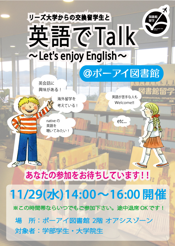 一覧へ 【ポーアイ館】〈終了〉「英語でTalk~Let's enjoy English~」を開催します 投稿日時: 2017/11/18 図書館管理者 【ポーアイ図書館】「英語でTalk~Let's enjoy English~」を開催します