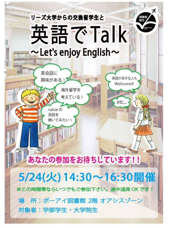 一覧へ 【ポーアイ館】〈終了〉図書館留学「英語でTalk~Let's enjoy English~」を開催します 投稿日時: 2016/05/02 図書館管理者 「英語でTalk~Let's enjoy English~」を開催します