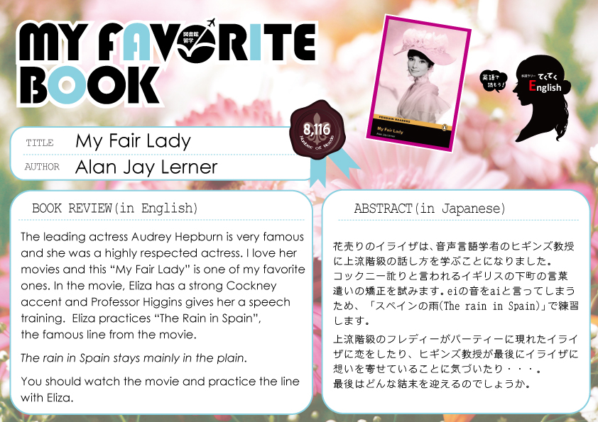 一覧へ 【全館】〈終了〉My Favorite Book「My Fair Lady」を開催しています 投稿日時: 2017/08/02 図書館管理者 My Favorite Book(安田有紀子先生)My Fair Lady※ポーアイ図書館2階図書館留学コーナーにて展示しています。※有瀬図書館新館1階A図書館留学コーナーに展示しています。