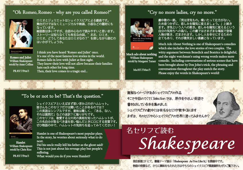 一覧へ 【有瀬館】〈終了〉てくてくSelection「名セリフで読むShakespeare」を開催しています 投稿日時: 2016/01/27 図書館管理者 てくてくSelection名セリフで読むShakespeare書籍リストはこちら.pdf ※有瀬図書館新館1階Aにて展示しています。