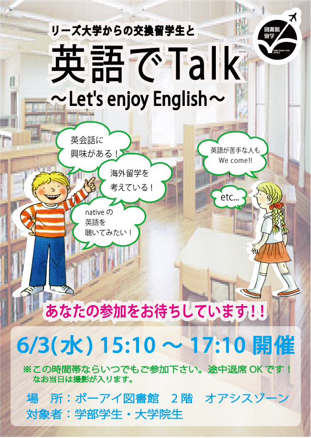 一覧へ 【ポーアイ館】〈終了〉図書館留学「英語でTalk~Let's enjoy English」を開催します 投稿日時: 2015/05/25 図書館管理者 「英語でTalk~Let's enjoy English」を開催します