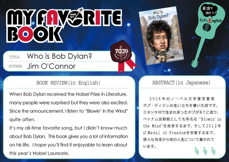 一覧へ 【全館】〈終了〉My Favorite Book「Who is Bob Dylan?」を開催しています 投稿日時: 2017/01/17 図書館管理者 My Favorite Book(安田有紀子先生)Who is Bob Dylan?※ポーアイ図書館2階図書館留学コーナーにて展示しています。※有瀬図書館新館1階A図書館留学コーナーに展示しています。