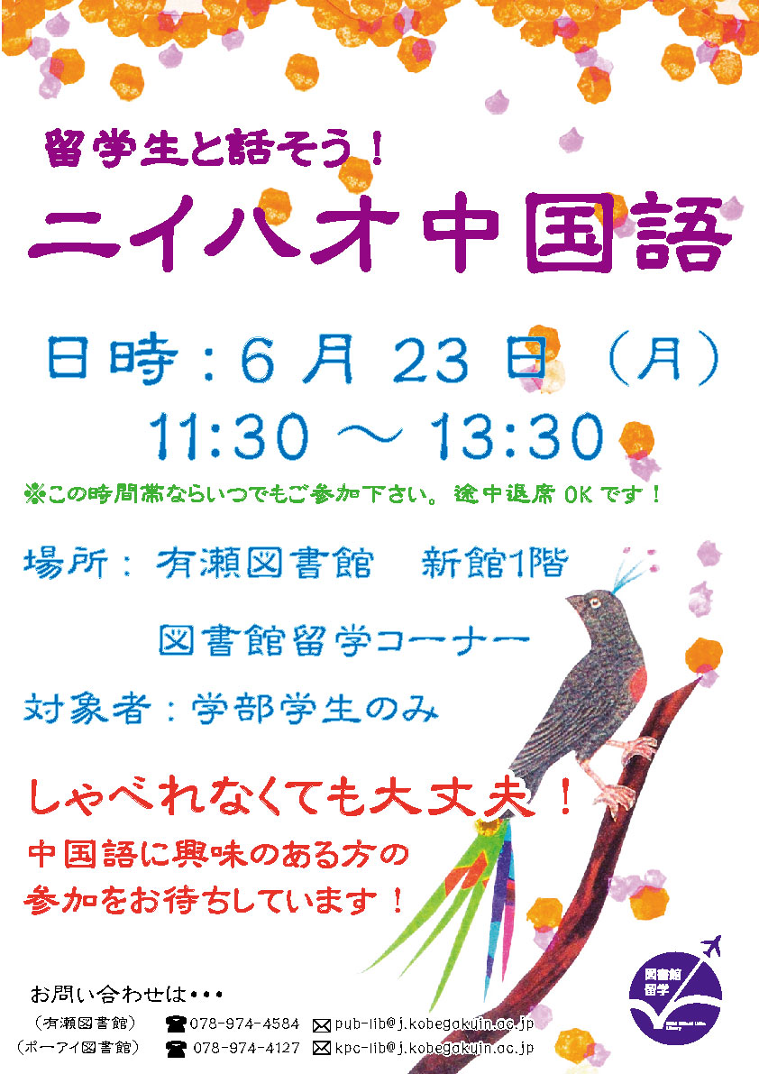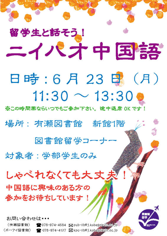 留学生の皆さんは日本語も堪能ですので、しゃべれなくても大丈夫!生の中国語に触れる刺激を味わいたい方、ぜひ参加をお待ちしています。詳しくは図書館カウンターまでお問い合わせください。