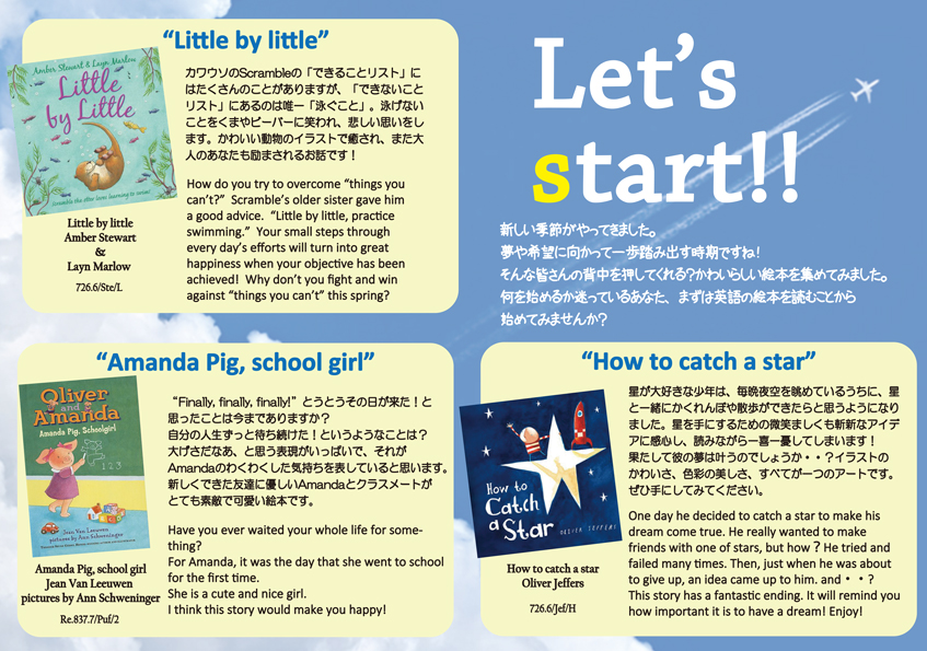 一覧へ 【有瀬館】〈終了〉てくてくSelection「Let's Start!!」を開催しています 投稿日時: 2016/04/11 図書館管理者 てくてくSelectionLet's Start!!書籍リストはこちら.pdf ※有瀬図書館新館1階Aにて展示しています。