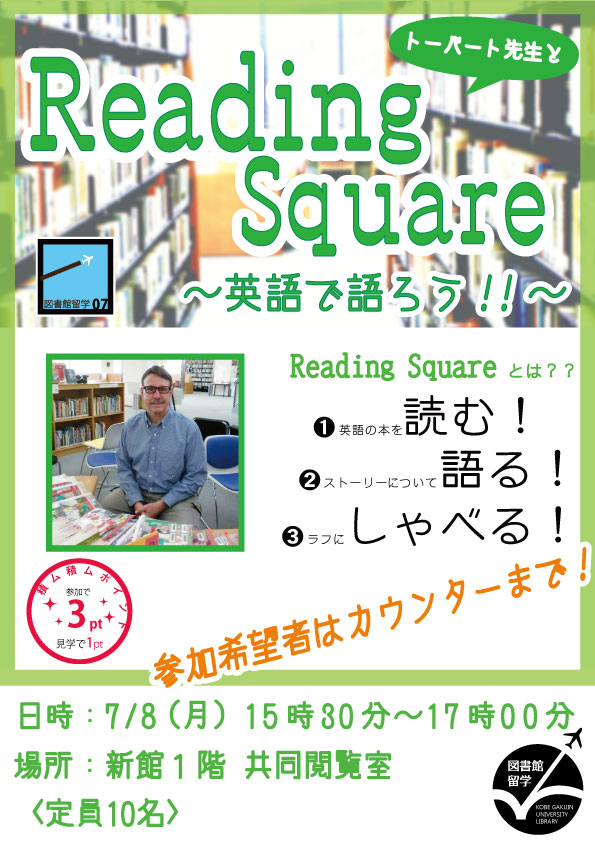 一覧へ 【有瀬館】〈終了〉トーバート先生とReading Square~英語で語ろう!!~を開催します 投稿日時: 2019/06/12 図書館管理者 トーバート先生とReading Square~英語で語ろう!!~を開催します。