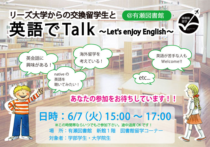 一覧へ 【有瀬館】〈終了〉図書館留学「英語でTalk~Let's enjoy English~」を開催します 投稿日時: 2016/05/28 図書館管理者 「英語でTalk~Let's enjoy English~」を開催します