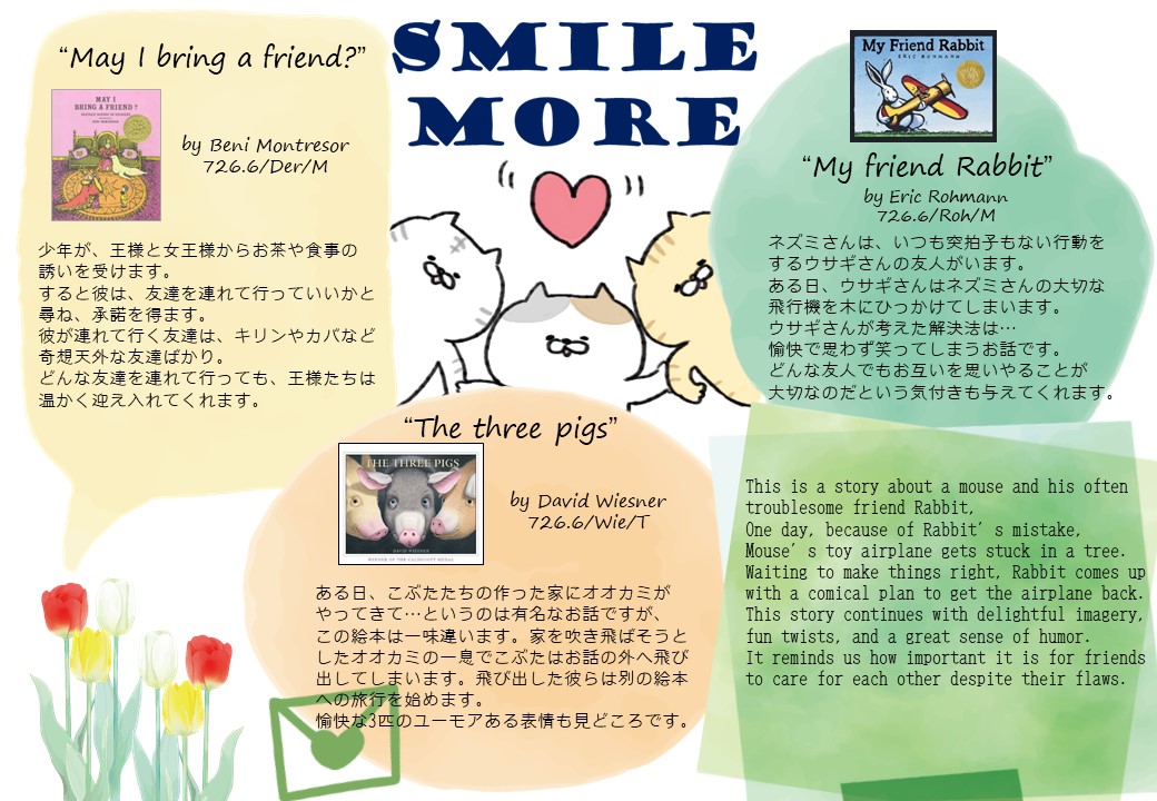 一覧へ 【ポーアイ館】〈終了〉てくてくSelection「SMILE MORE」を開催しています 投稿日時: 2024/02/21 図書館管理者 てくてくSelectionSMILE MORE ※ポーアイ図書館2階図書館留学コーナーにて展示しています。