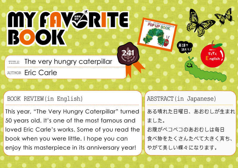 My Favorite Book(安田有紀子先生)The very hungry caterpillar※ポーアイ図書館2階図書館留学コーナーにて展示しています。※有瀬図書館新館1階A図書館留学コーナーに展示しています。