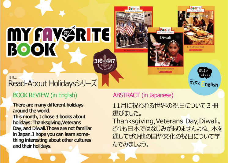 一覧へ 【有瀬館・ポーアイ館】〈終了〉My Favorite Book「Read About Holidaysシリーズ」を開催しています 投稿日時: 2014/11/07 図書館管理者 My Favorite Book(安田有紀子先生)Read About Holidaysシリーズ ※有瀬図書館新館1階Aにて展示しています。 ※ポーアイ館2階西 図書館留学コーナーに展示しています。