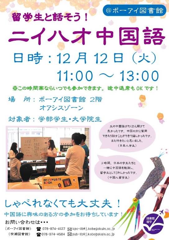 留学生の皆さんは日本語も堪能ですので、しゃべれなくても大丈夫!生の中国語に触れる刺激を味わいたい方、ぜひ参加をお待ちしています。詳しくは図書館カウンターまでお問い合わせください。