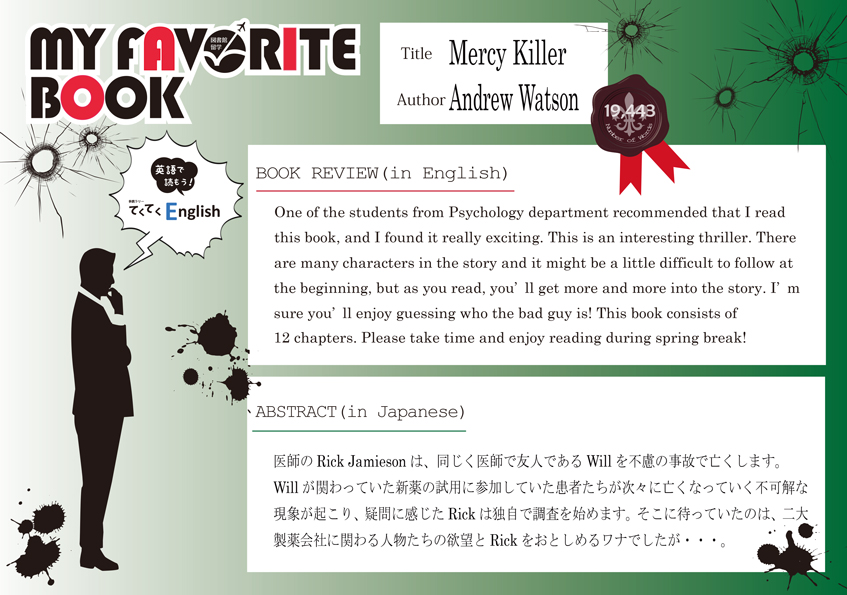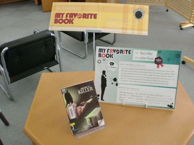 一覧へ 【有瀬館】〈終了〉My Favorite Book「Mercy Killer」を開催しています 投稿日時: 2015/01/15 図書館管理者 My Favorite Book(安田有紀子先生)Mercy Killer ※有瀬図書館新館1階Aにて展示しています。 ※ポーアイ館2階西 図書館留学コーナーに展示しています。