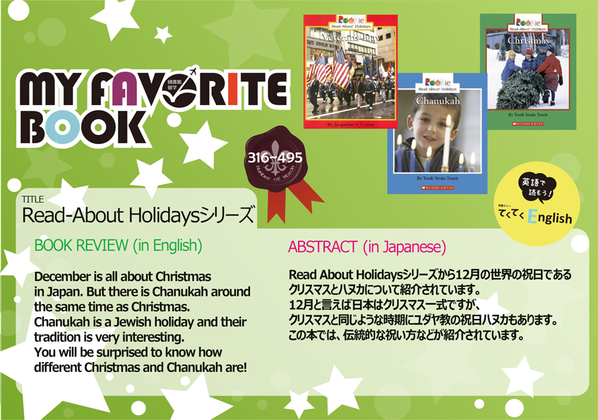 一覧へ 【有瀬館・ポーアイ館】〈終了〉My Fvorite Book「Read About Holidaysシリーズ」を開催しています 投稿日時: 2014/12/17 図書館管理者 My Favorite Book(安田有紀子先生)Read About Holidaysシリーズ ※有瀬図書館新館1階Aにて展示しています。 ※ポーアイ館2階西 図書館留学コーナーに展示しています。