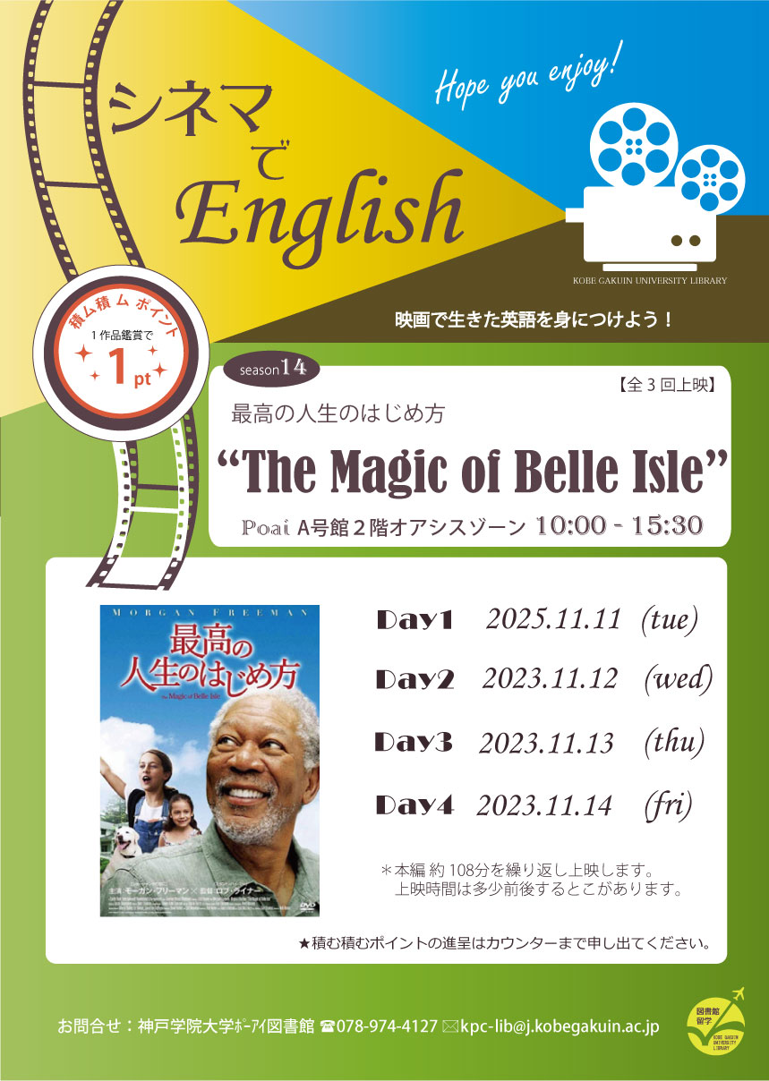 一覧へ 【ポーアイ館】〈終了〉シネマでEnglish「最高の人生のはじめ方」を開催します 投稿日時: 2025/10/20 図書館管理者 【ポーアイ図書館】シネマでEnglish「最高の人生のはじめ方」を開催します。