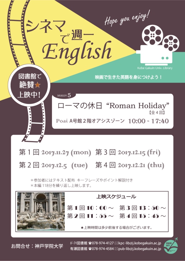 一覧へ 【ポーアイ館】〈終了〉シネマで週一English「Roman Holiday」を開催します 投稿日時: 2017/11/18 図書館管理者 【ポーアイ図書館】シネマで週一English「Roman Holiday」を開催します。