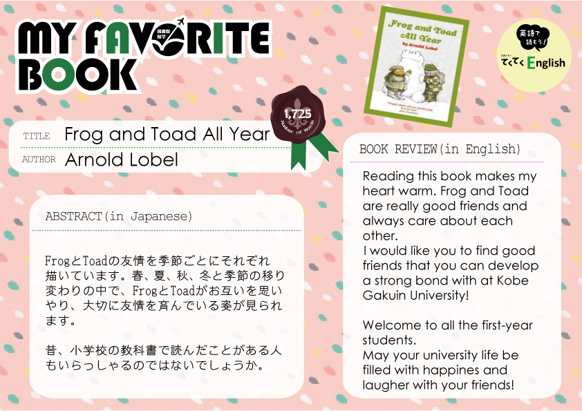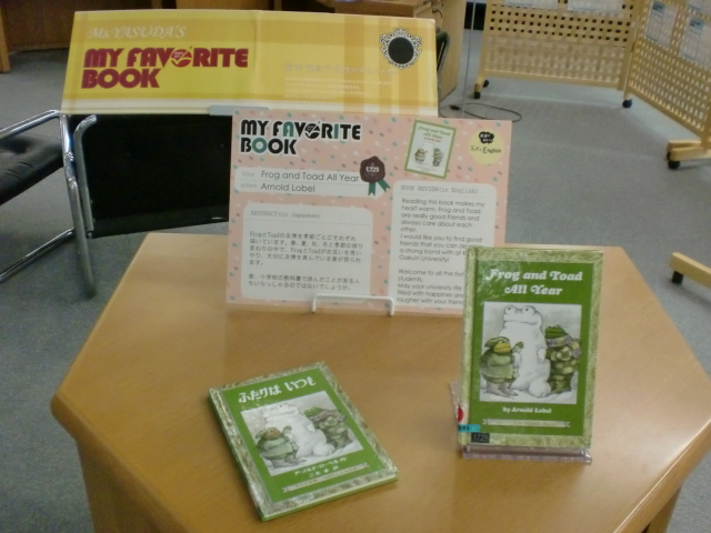 一覧へ 【有瀬館】〈終了〉My Favorite Book「Frog and Toad All Year」を開催しています 投稿日時: 2015/04/17 図書館管理者 My Favorite Book(安田有紀子先生)Frog and Toad All Year ※有瀬図書館新館1階Aにて展示しています。