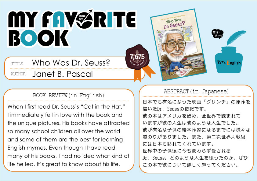 一覧へ 【全館】〈終了〉My Favorite Book 「Who Was Dr.Seuss?」を開催しています 投稿日時: 2016/08/03 図書館管理者 My Favorite Book(安田有紀子先生)Who Was Dr.Seuss?※ポーアイ図書館2階図書館留学コーナーにて展示しています。※有瀬図書館新館1階A図書館留学コーナーに展示しています。