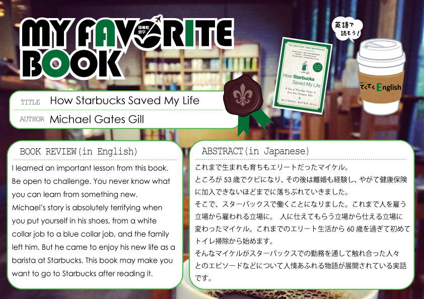 My Favorite Book(安田有紀子先生)How Starbucks Saved My Life※ポーアイ図書館2階図書館留学コーナーにて展示しています。※有瀬図書館新館1階A図書館留学コーナーに展示しています。
