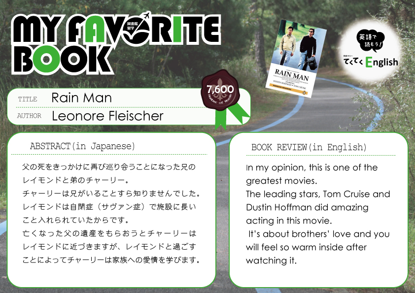 一覧へ 【全館】〈終了〉My Favorite Book「Rain Man」を開催しています 投稿日時: 2018/02/16 図書館管理者 My Favorite Book(安田有紀子先生)Rain Man※ポーアイ図書館2階図書館留学コーナーにて展示しています。※有瀬図書館新館1階A図書館留学コーナーに展示しています。