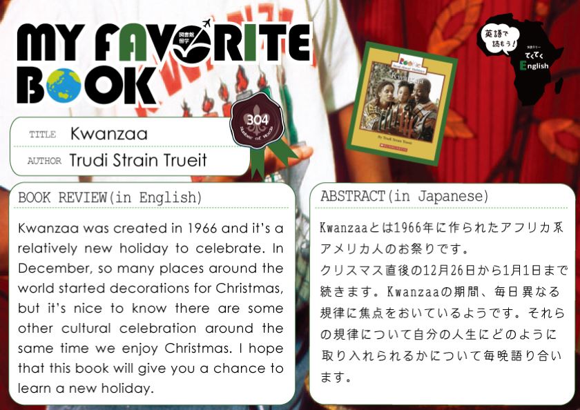 一覧へ 【全館】〈終了〉My Favorite Book「Kwanzaa」を開催しています 投稿日時: 2019/12/05 図書館管理者 My Favorite Book(安田有紀子先生)Kwanzaa※ポーアイ図書館2階図書館留学コーナーにて展示しています。※有瀬図書館新館1階A図書館留学コーナーに展示しています。