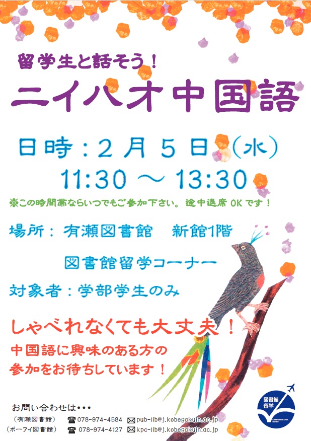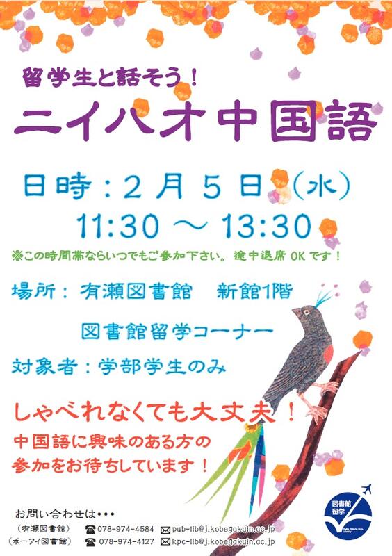 留学生の皆さんは日本語も堪能ですので、しゃべれなくても大丈夫!生の中国語に触れる刺激を味わいたい方、ぜひ参加をお待ちしています。詳しくは図書館カウンターまでお問い合わせください。