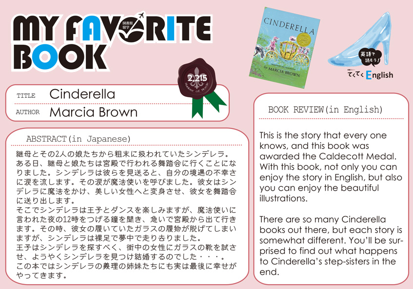 一覧へ 【全館】〈終了〉My Favorite Book「Cinderella」を開催しています 投稿日時: 2015/10/06 図書館管理者 My Favorite Book(安田有紀子先生)Cinderella※ポーアイ館2階図書館留学コーナーに展示しています。※有瀬館新館1階Aにて展示しています。