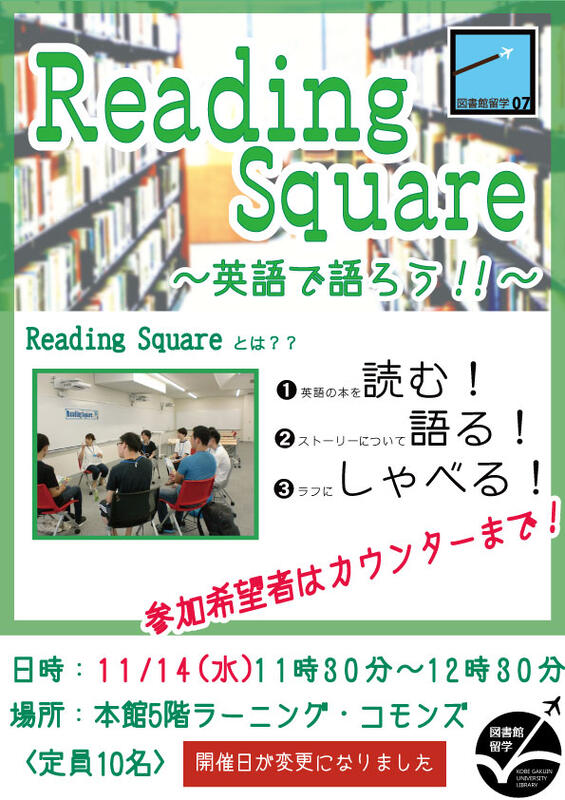 「Reading Square~英語で語ろう!!~」は、下記の通り開催日を変更いたします。