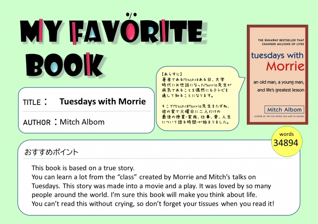 My Favorite Book(安田有紀子先生)Tuesdays witn Morrie※ポーアイ図書館2階図書館留学コーナーにて展示しています。※有瀬図書館新館1階A図書館留学コーナーに展示しています。