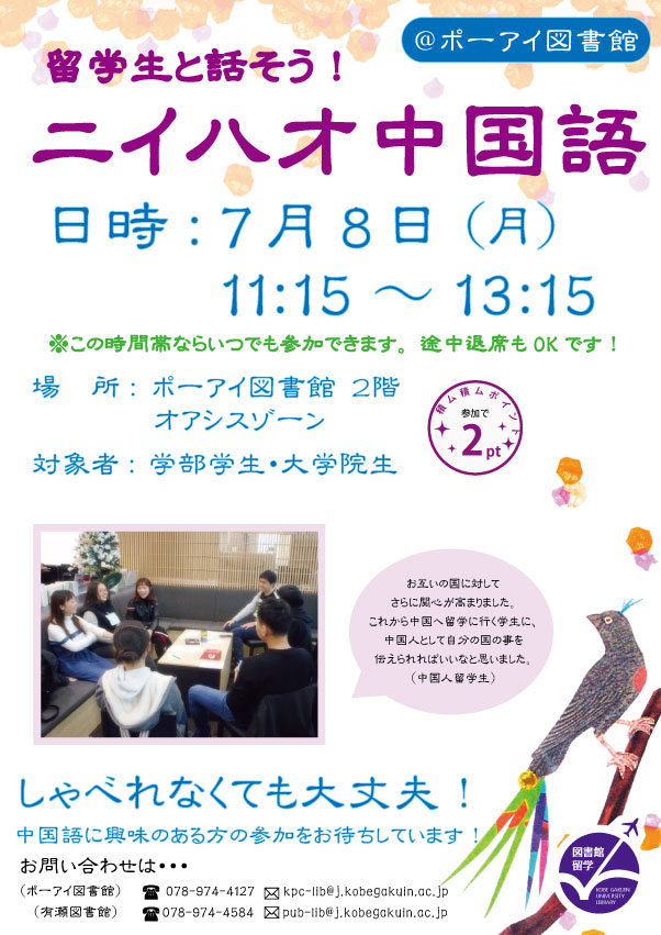 留学生の皆さんは日本語も堪能ですので、しゃべれなくても大丈夫!生の中国語に触れる刺激を味わいたい方、ぜひ参加をお待ちしています。詳しくは図書館カウンターまでお問い合わせください。