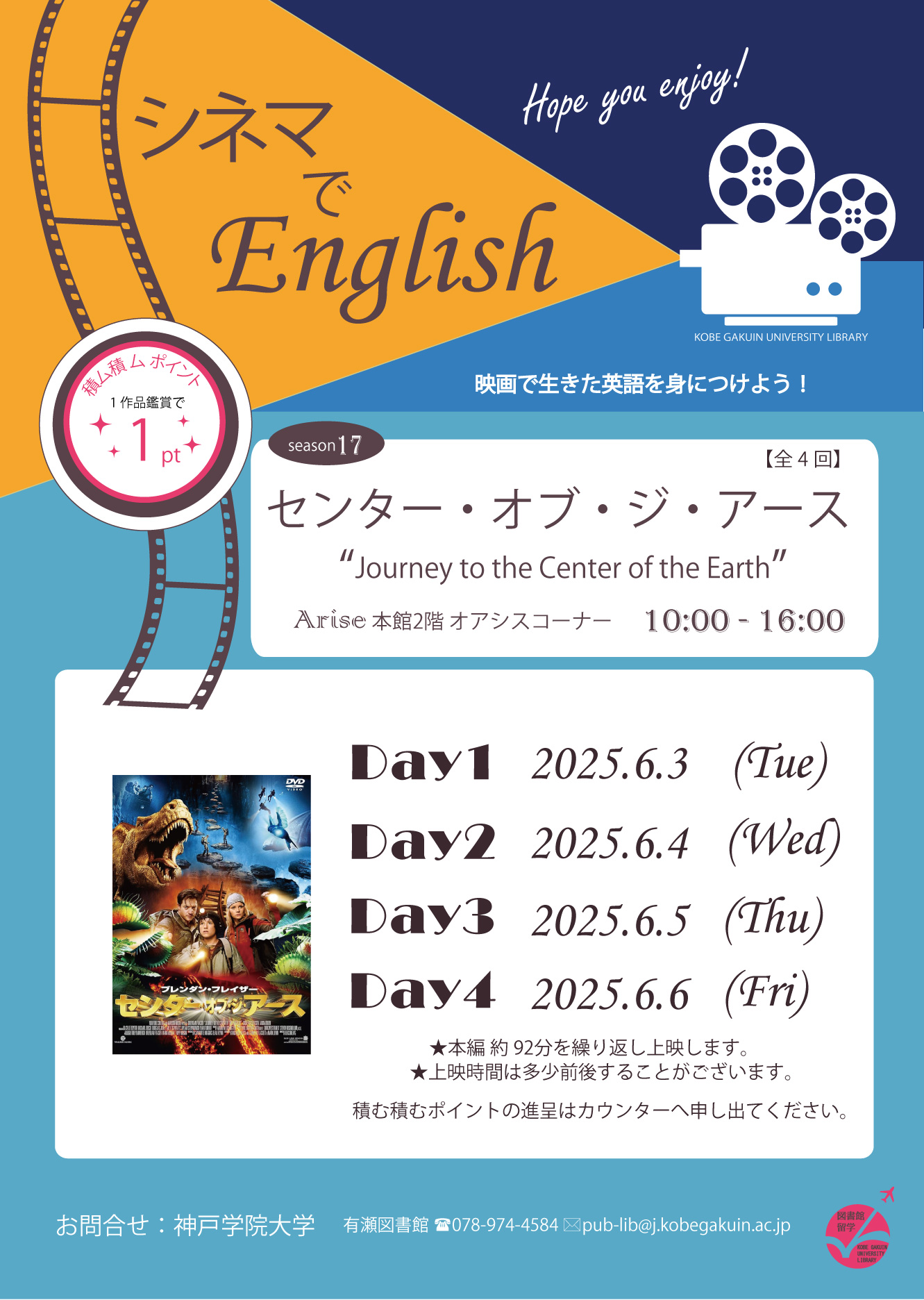 一覧へ 【有瀬館】〈終了〉シネマでEnglish「センター・オブ・ジ・アース」を開催します 投稿日時: 2025/05/09 図書館管理者 【有瀬図書館】シネマでEnglish「センター・オブ・ジ・アース」を開催します。