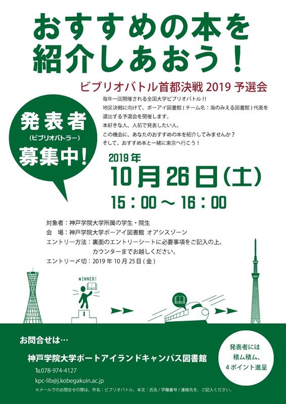 一覧へ 【ポーアイ館】〈終了〉全国大学ビブリオバトル2019予選会を開催します 投稿日時: 2019/10/10 図書館管理者 全国大学ビブリオバトル2019予選会を開催します。今年度より、学外の大学生・院生・高専生の参加も可能になりました。奮ってご参加ください。 <<申込フォーム>>