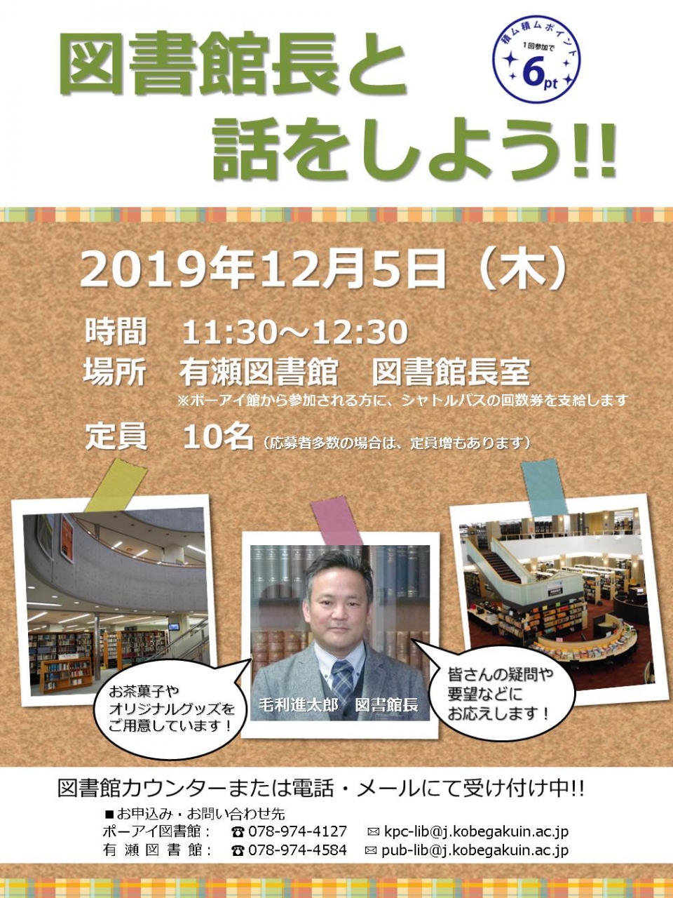 「図書館長と話をしよう!」を開催します。2019年12月5日(木)11:30~12:30 「学生ニーズに応える大学づくり」「元気・そして活力のある図書館」を目指し、今年度も館長懇談会を企画しました。この機会に、普段から気になっていたことなど館長を交えて話をしてみませんか。皆さんのご意見・ご提案をぜひお聞かせください。お申込み・お問い合わせはポーアイ図書館・有瀬図書館の各メインカウンターまで