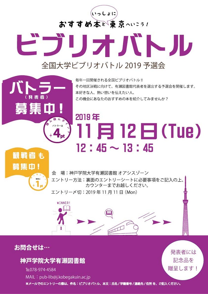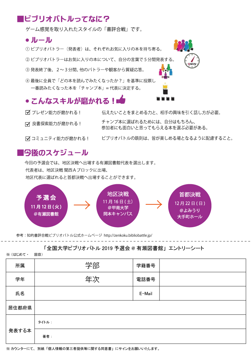 一覧へ 【有瀬館】〈終了〉全国大学ビブリオバトル2019予選会を開催します 投稿日時: 2019/10/10 図書館管理者 全国大学ビブリオバトル2019予選会を開催します。今年度より、学外の大学生・院生・高専生の参加も可能になりました。奮ってご参加ください。 <<申込フォーム>>