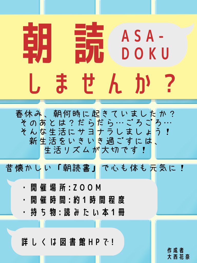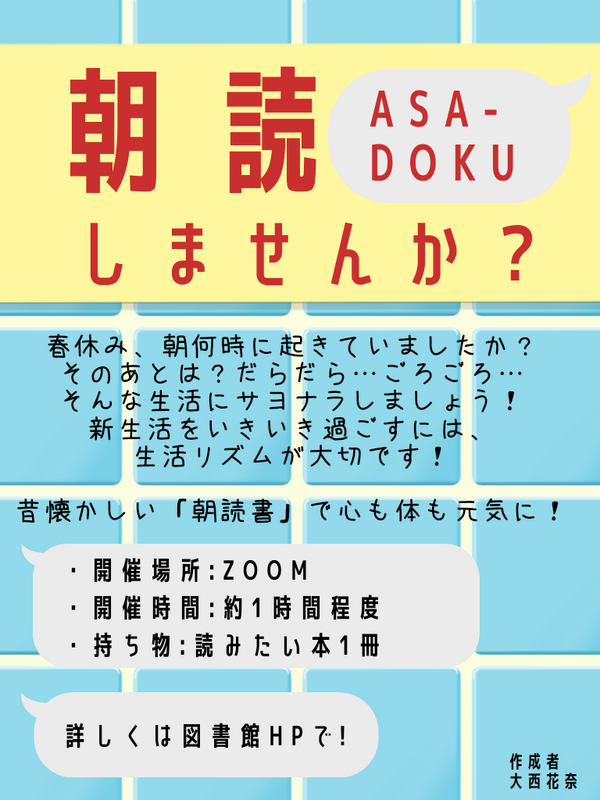 学生ボランティア企画イベント「朝読しませんか」をZOOMで開催いたします。オンライン授業で乱れた生活リズム、朝読を始めて正していきませんか。ご希望の方は、メールにてお申し込みください。